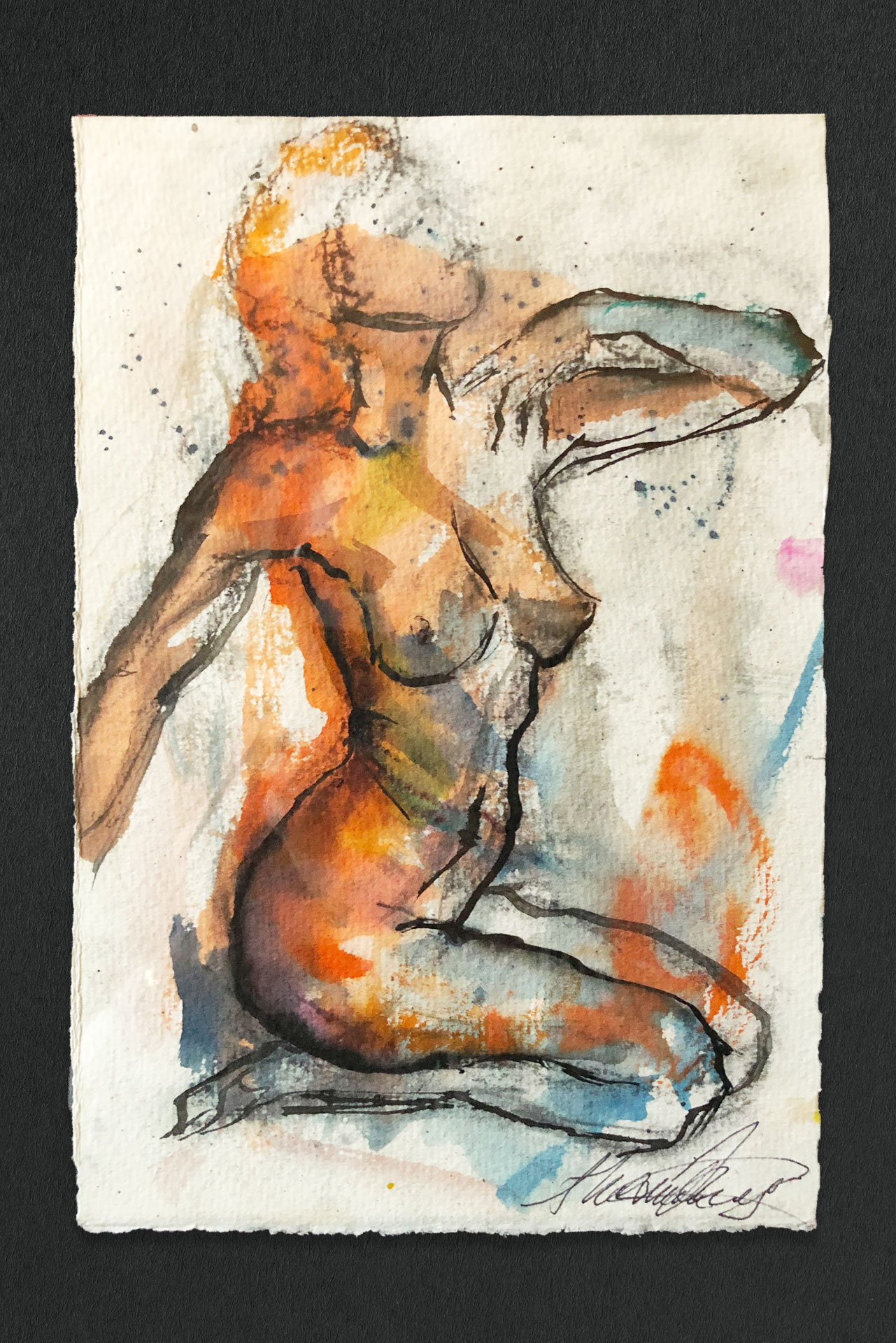 Abstract figurative ink artwork of a woman using black and coloured ink by Alexandra Kay Vøhtz.
